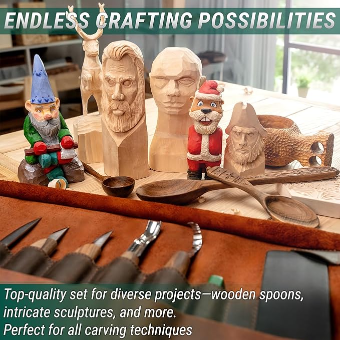 - Wood Carving Knife Set All-in-One: This wood carving knife set contains 8 whittling tools and a stropping kit that are here to help you in reaching perfection in your handicraft.